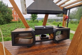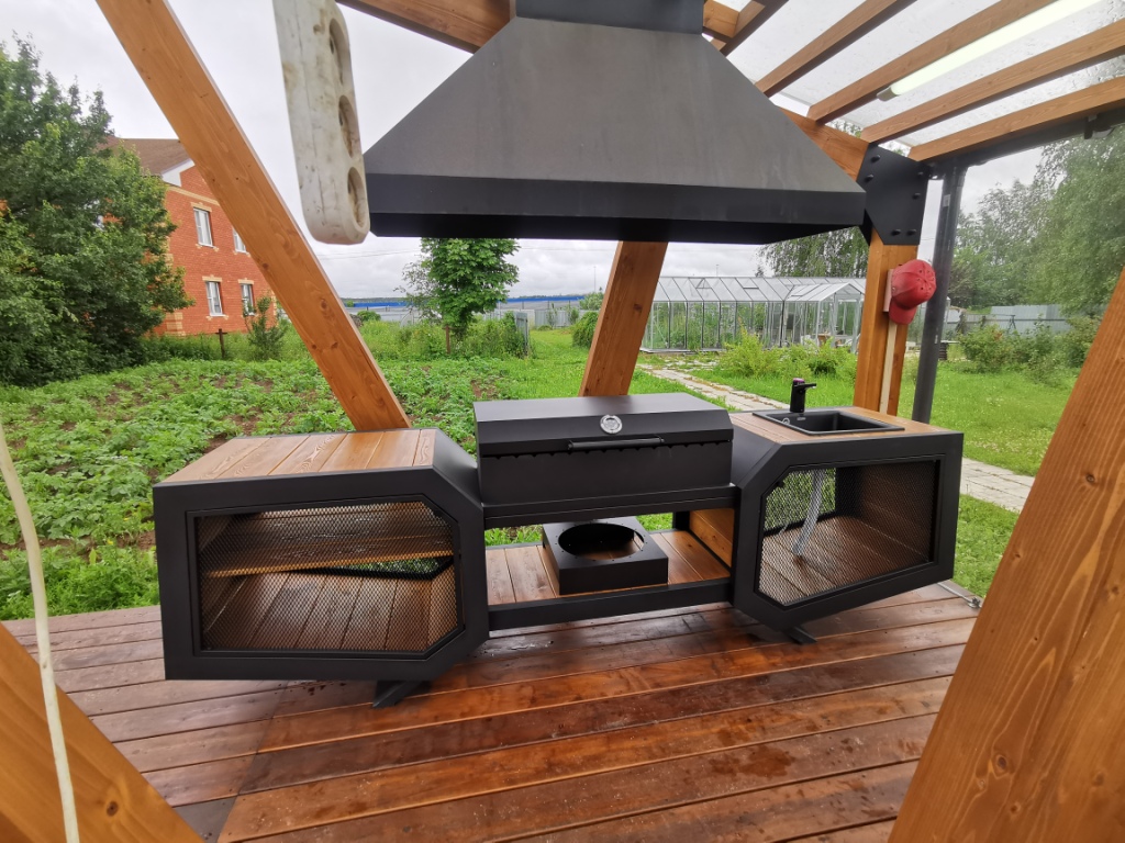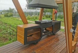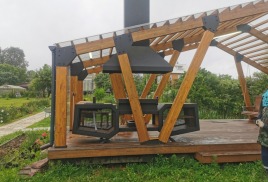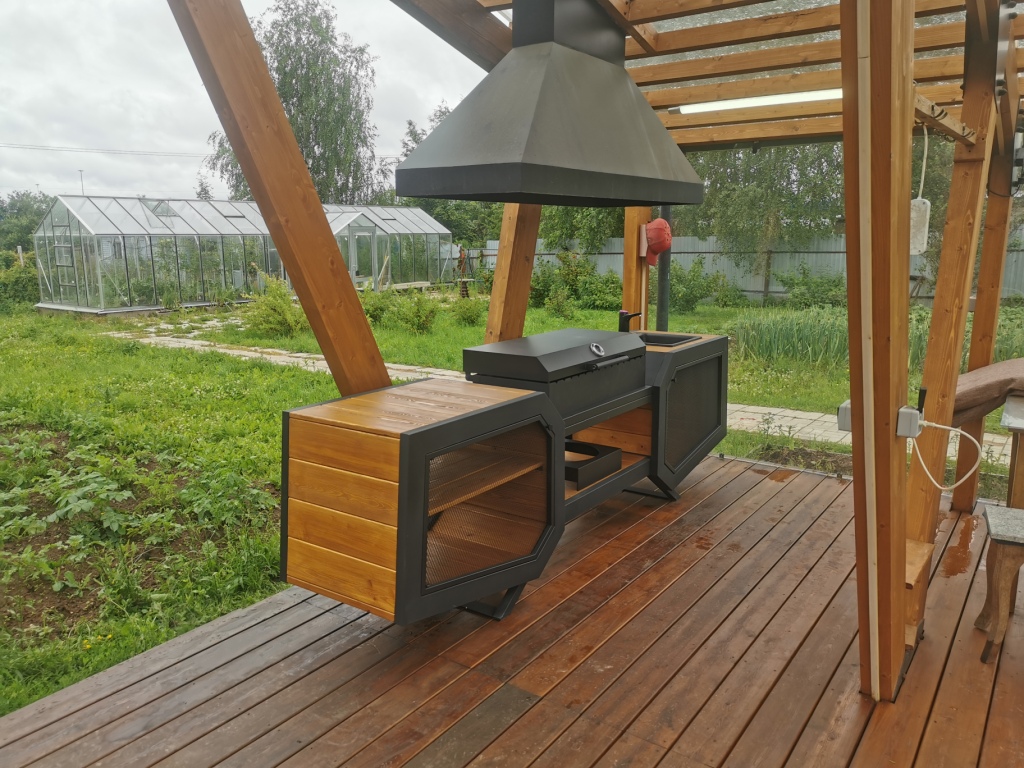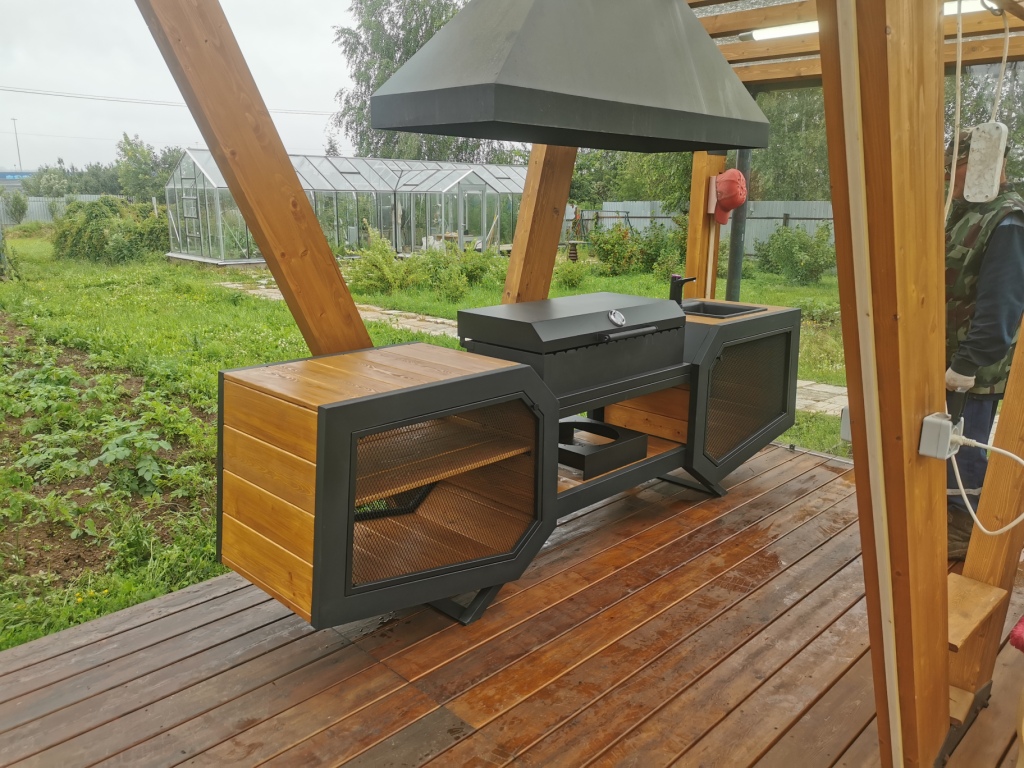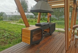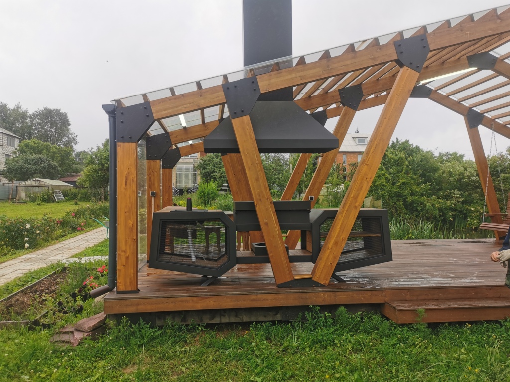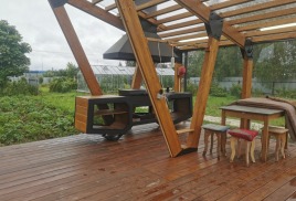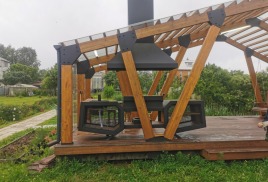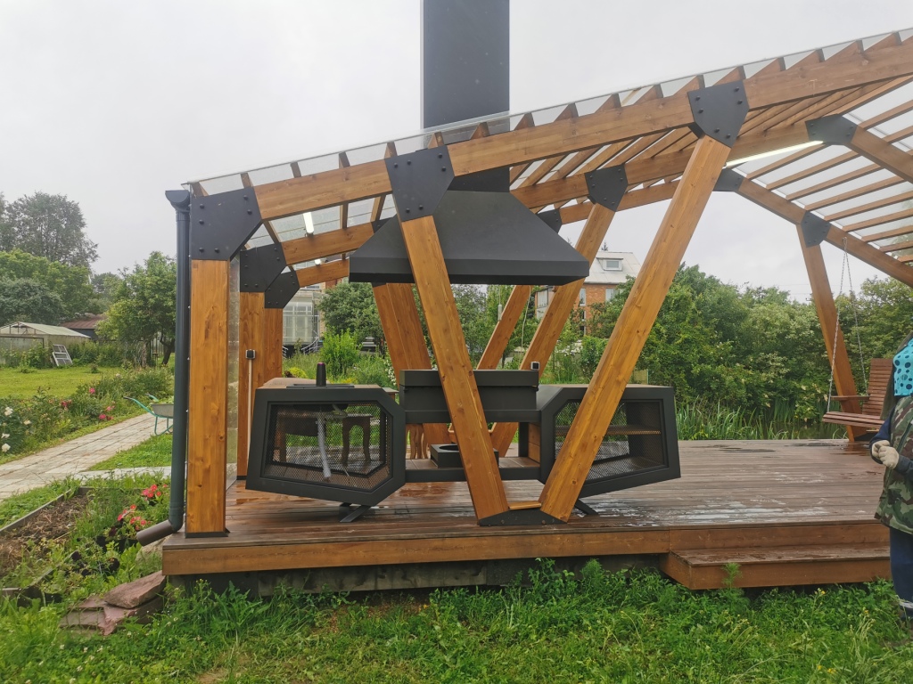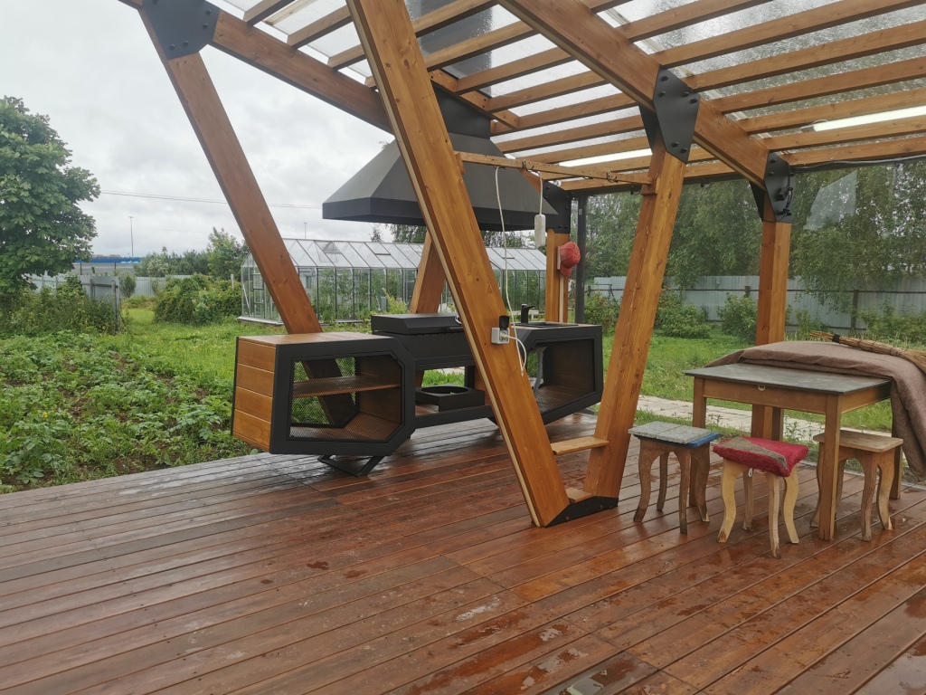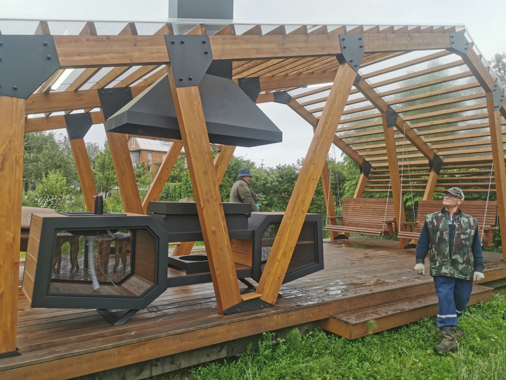 Построили современную беседку в городе Солнечногорск Московской области, габаритные размеры беседки 4х9 метров, крыша монолитный поликарбонат, силовая часть клееный брус, отделка из лиственницы. Дополнительно установили покупные качели и вытяжку для барбекю.