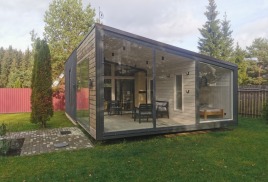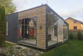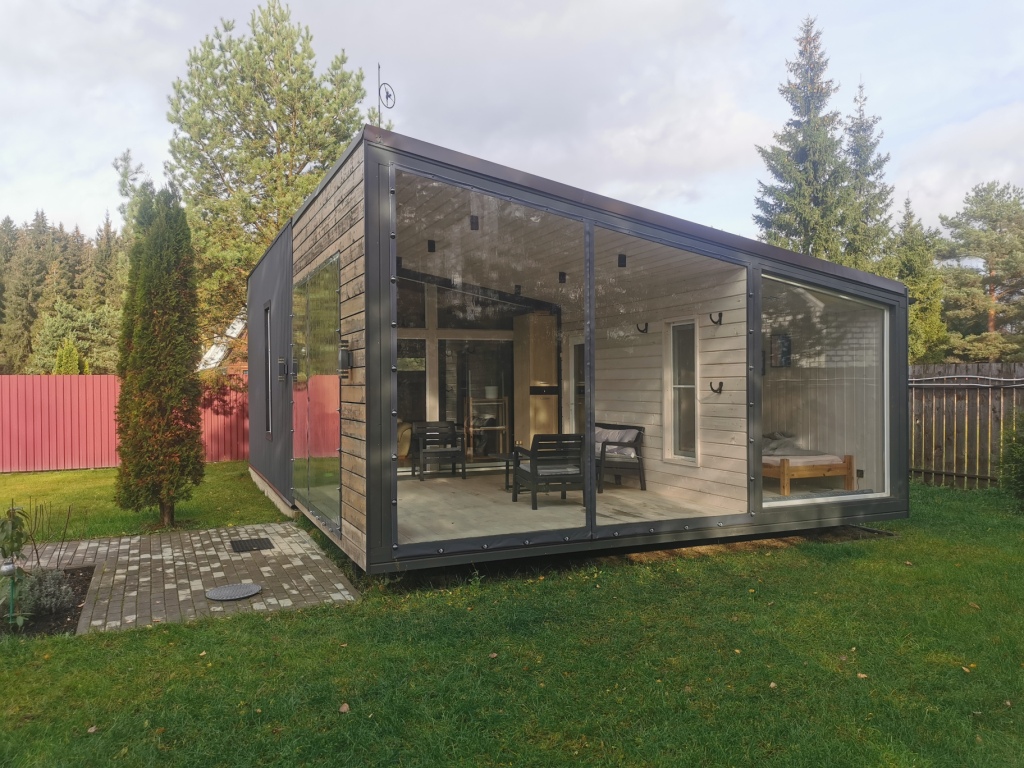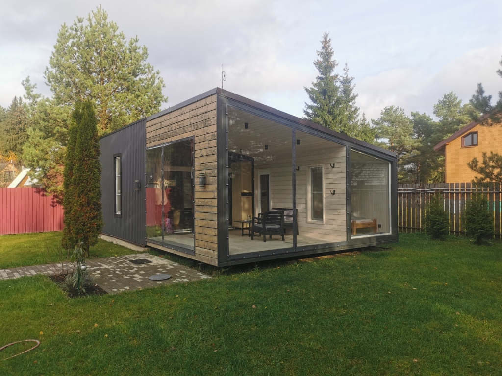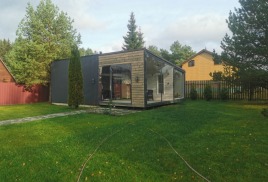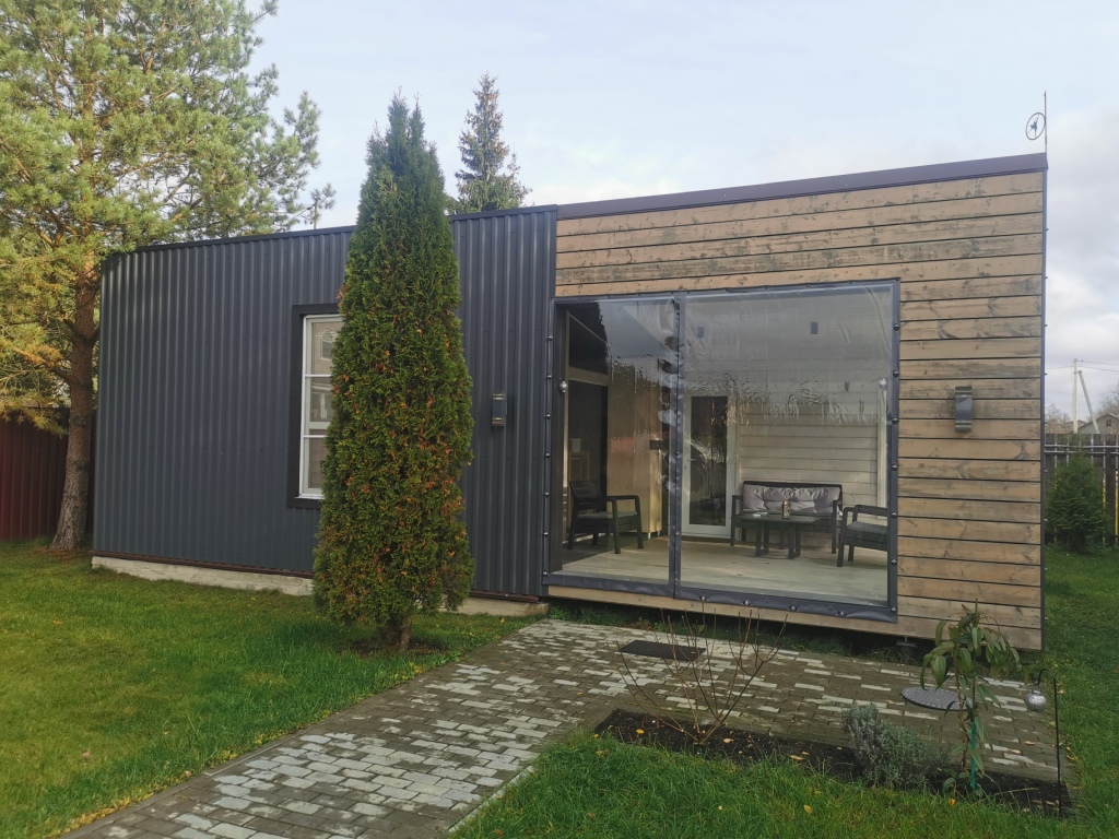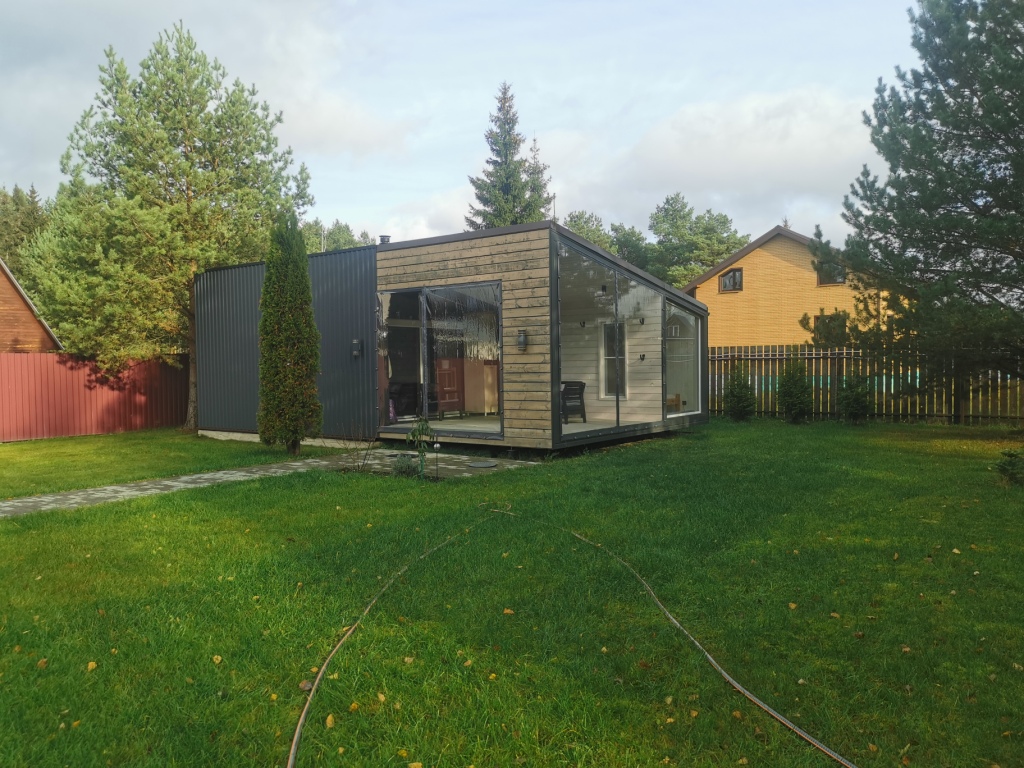 Построен компактный дом в городе Конаково Тверская область. Габаритные размеры 6 х 6 метра, с панорамным остеклением, в домике санузел, кухня и просторная комната отдыха с чугунной печкой от компании ПЛАМЕН с черным дымоходом. Фасад отделан временно строганной доской. в будущем планируется отделка доской ДПК вертикальная раскладка. В процессе отделки дешевую пластиковую дверь которая досталась нам бесплатно заменили на хорошо утепленную уличную, хотели сэкономить но не получилось!