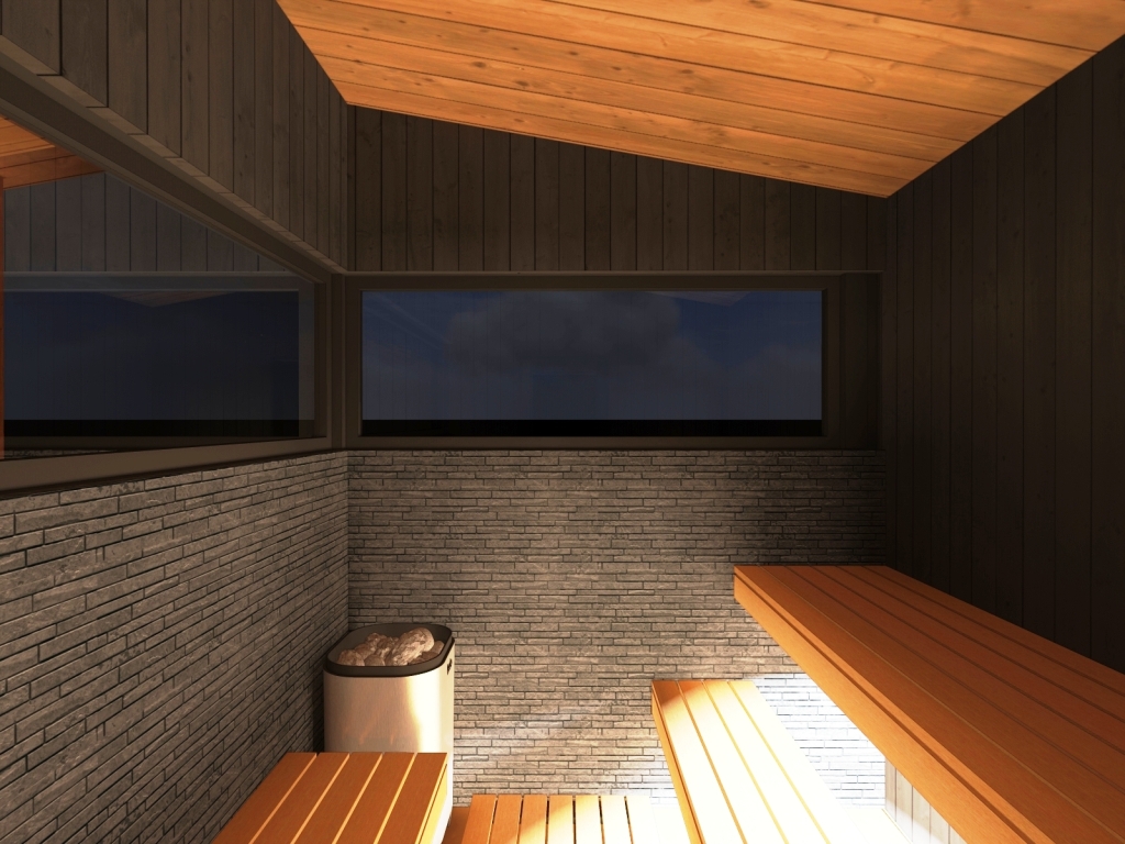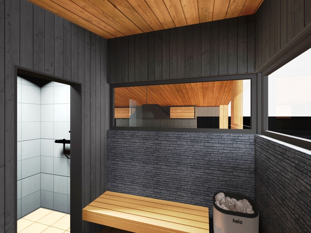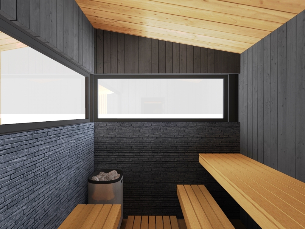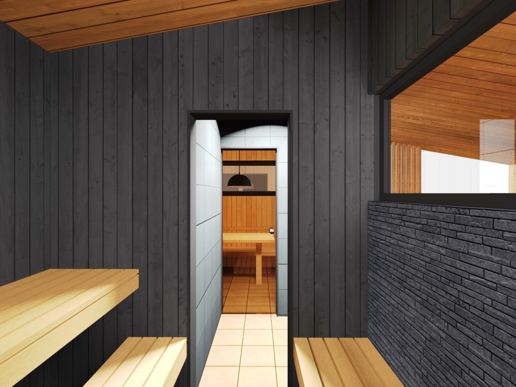 5. Отделка - планкен лиственница, имитация бруса, керамическая плитка и вагонка липа в парной.
